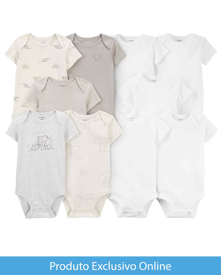 O Enxoval bebê 10 peças lisos e elefantes multicor | Carter's será a pedida certa para aliar conforto e economia para o seu bebê. Produzido em algodão, o enxoval vem com oito bodies de manga curta, ombros traspassados e variam entre estampas diversas, mas também em versões lisas. Aproveite!