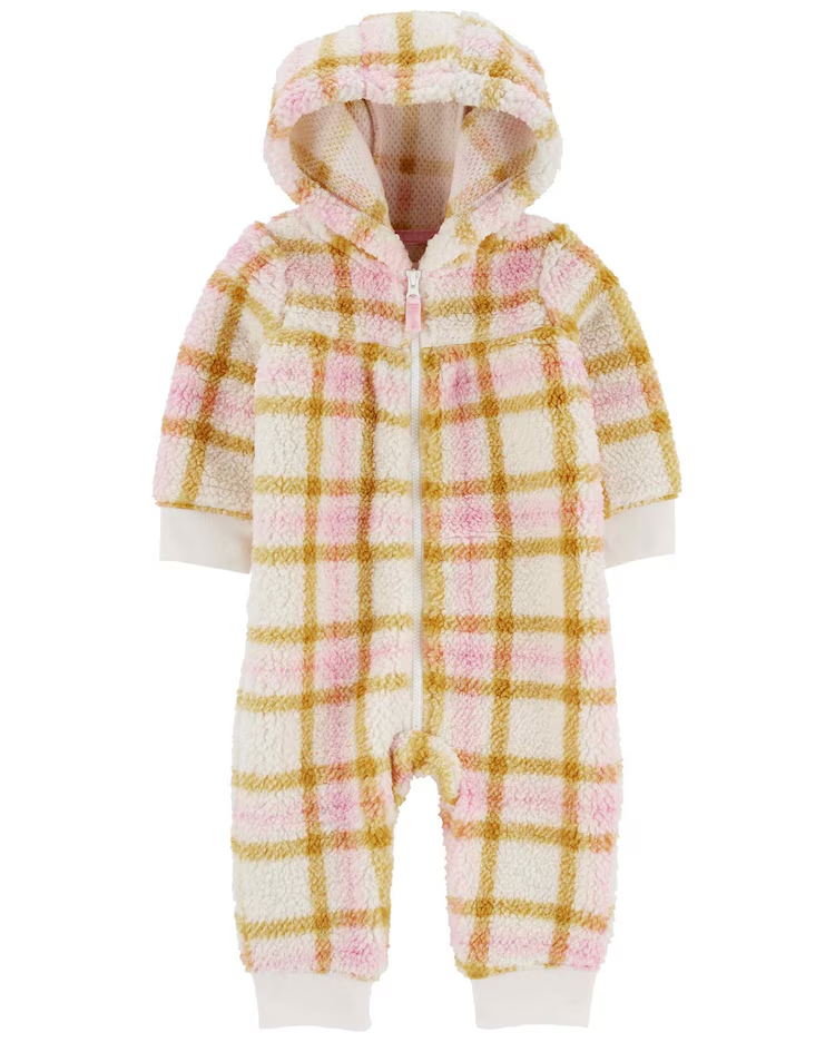 Após um dia de descobertas, o Macacão bebê peluciado com capuz xadrez bege | Carter's aparece para proporcionar conforto e fofura para sua baby. A peça é feita de tecido peluciado sendo ideal para os dias mais frios. Conta com acabamento em ribana canelada, capuz, estampa xadrez, além do fechamento por zíper e mangas longas para proteger a sua pequenininha. Aposte!