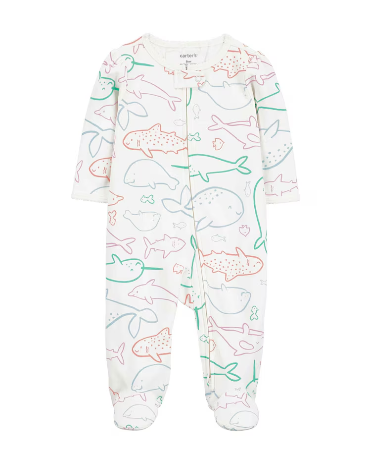 Super fofinho e confortável, o Macacão bebê com pezinho baleias branco | Carter's será a pedida certa para o seu neném. Feito de algodão, o macacão conta com fechamento por zíper inverso, possui martingale para garantir proteção e seu grande destaque está em sua estampa de baleias. Seja descansando ou se divertindo com os papais, a peça é certeira para esses momentos tão lindos e únicos!